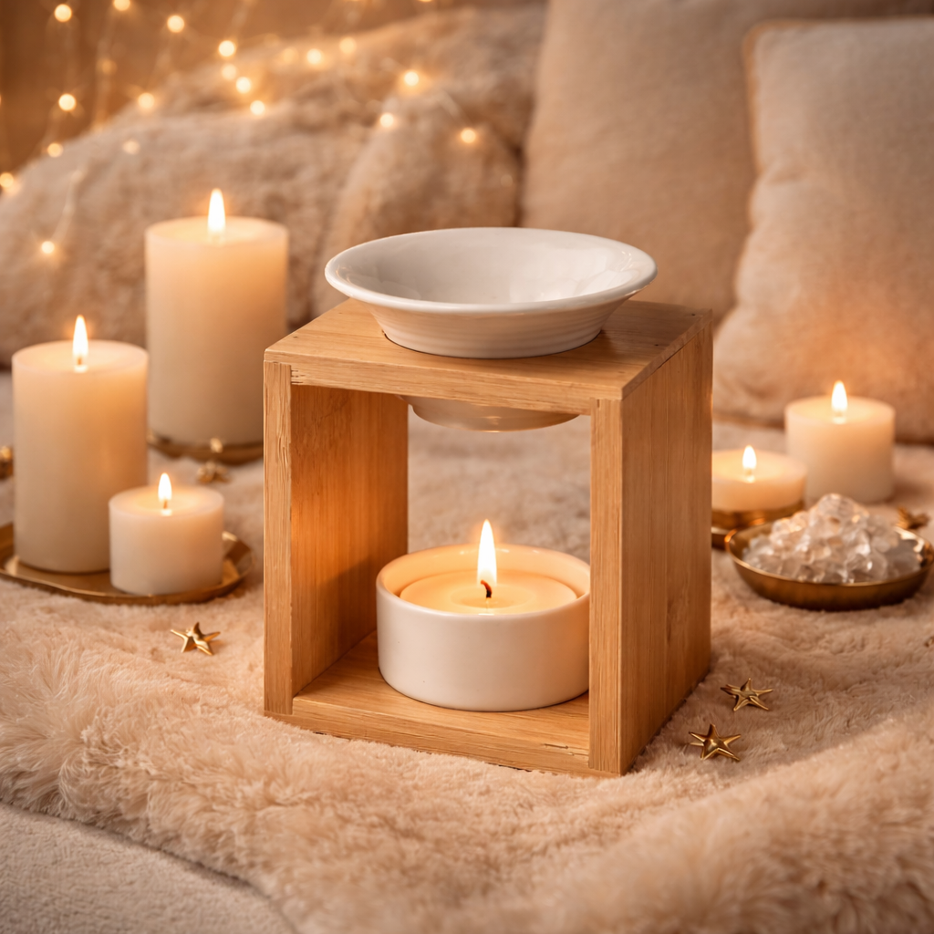 Sa coupelle d’une contenance de 55 ml est parfaitement adaptée pour vos cires ou fondants parfumés, de plus elle est amovible et peut donc se nettoyer facilement. La structure est en bambou . Le support en céramique accueille une bougie chauffe-plat (bougie non fournie).